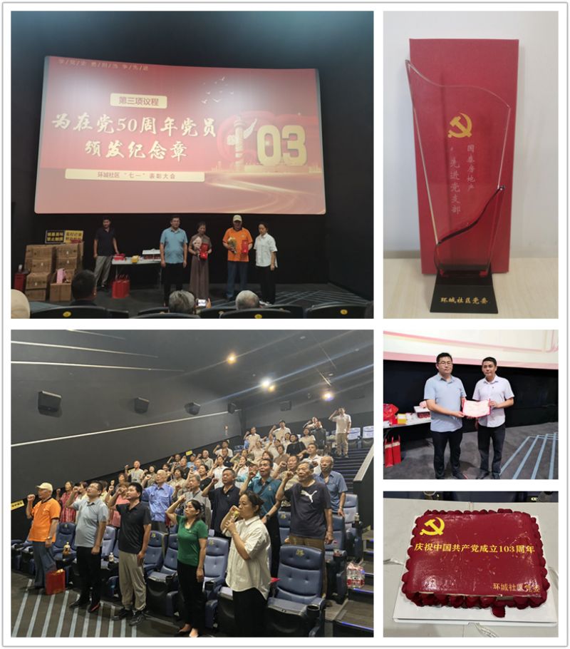 活動首先進行了表彰,環(huán)城辦事處相關(guān)負(fù)責(zé)人為國泰地產(chǎn)黨支部頒發(fā)年度“優(yōu)秀黨支部”獎杯、為國泰地產(chǎn)黨支部書記王宇恒頒發(fā)年度“優(yōu)秀共產(chǎn)黨員”證書。為在黨50年的老黨員代表頒發(fā)“光榮在黨50年”紀(jì)念章,并向老黨員同志致以崇高的敬意。