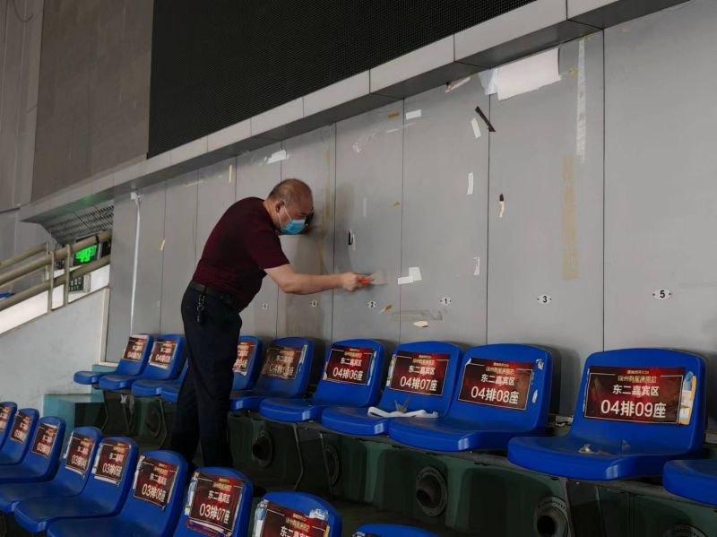 活動當天,全體黨員干部及部分不當班職工準時到達徐州體育館,按照預先分組進行任務分配,以主席臺為中心,向兩邊區(qū)域延伸進行地毯式清理。此次活動主要清理體育館內(nèi)部四周墻體,摘除過期廣告牌、鏟除墻面標簽及清理觀眾席衛(wèi)生死角等。