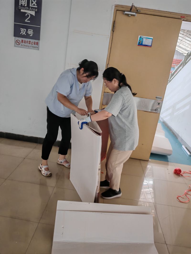 物業(yè)公司黨員干部及職工在館內(nèi)酷熱的環(huán)境下,積極投入清掃工作中,分工合作,有的負責摘除過期廣告牌、有的負責清運廣告牌、有的負責鏟除墻體雙面膠、有的負責清理平臺衛(wèi)生、有的負責粘貼區(qū)域標志,嚴格實行不間斷的巡回式清理,不放過任何一處衛(wèi)生死角。經(jīng)過大家一上午的努力,體育館內(nèi)部環(huán)境煥然一新。