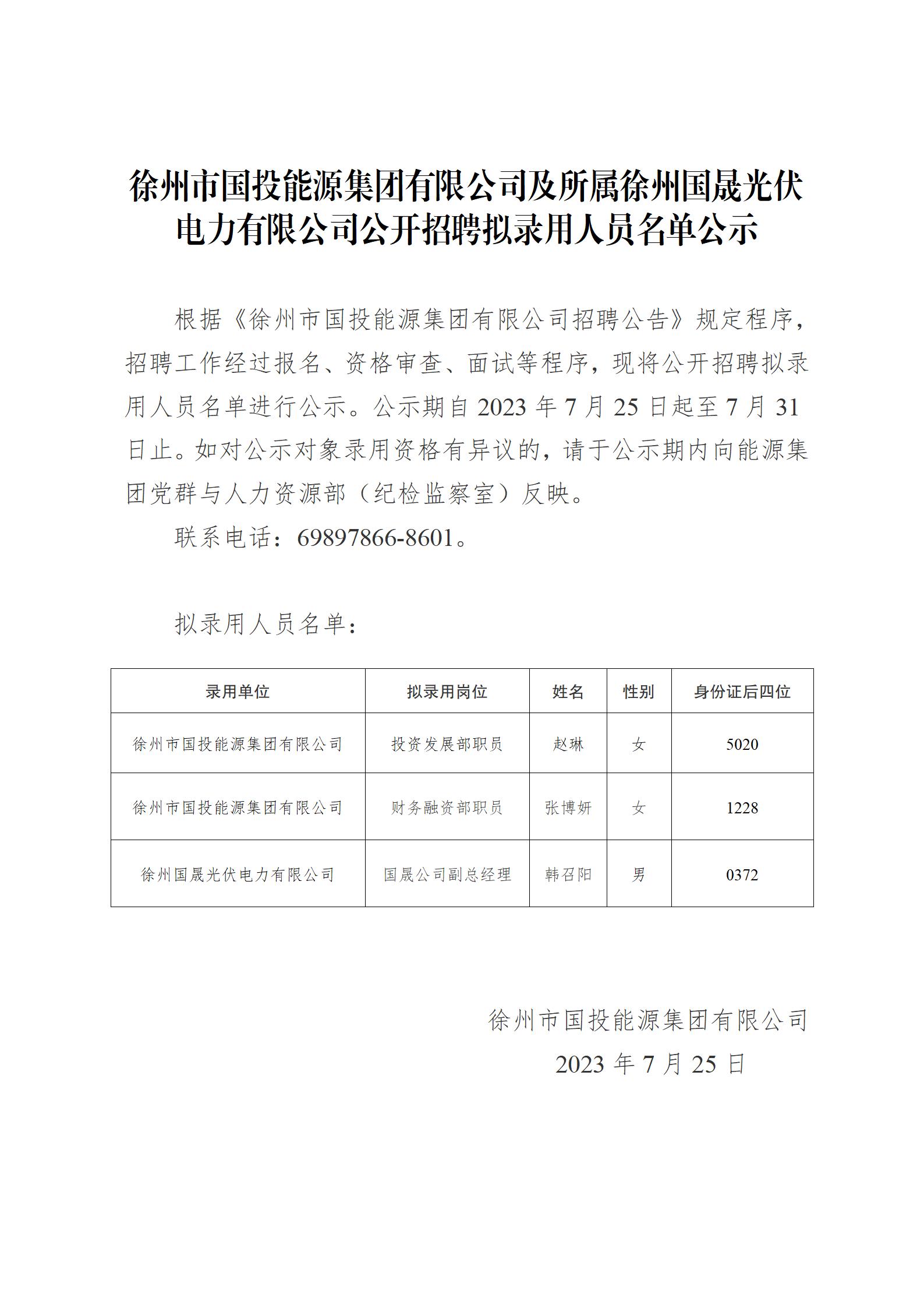 徐州市國(guó)投能源集團(tuán)有限公司及所屬徐州國(guó)晟光伏電力有限公司公開招聘擬錄用人員名單公示