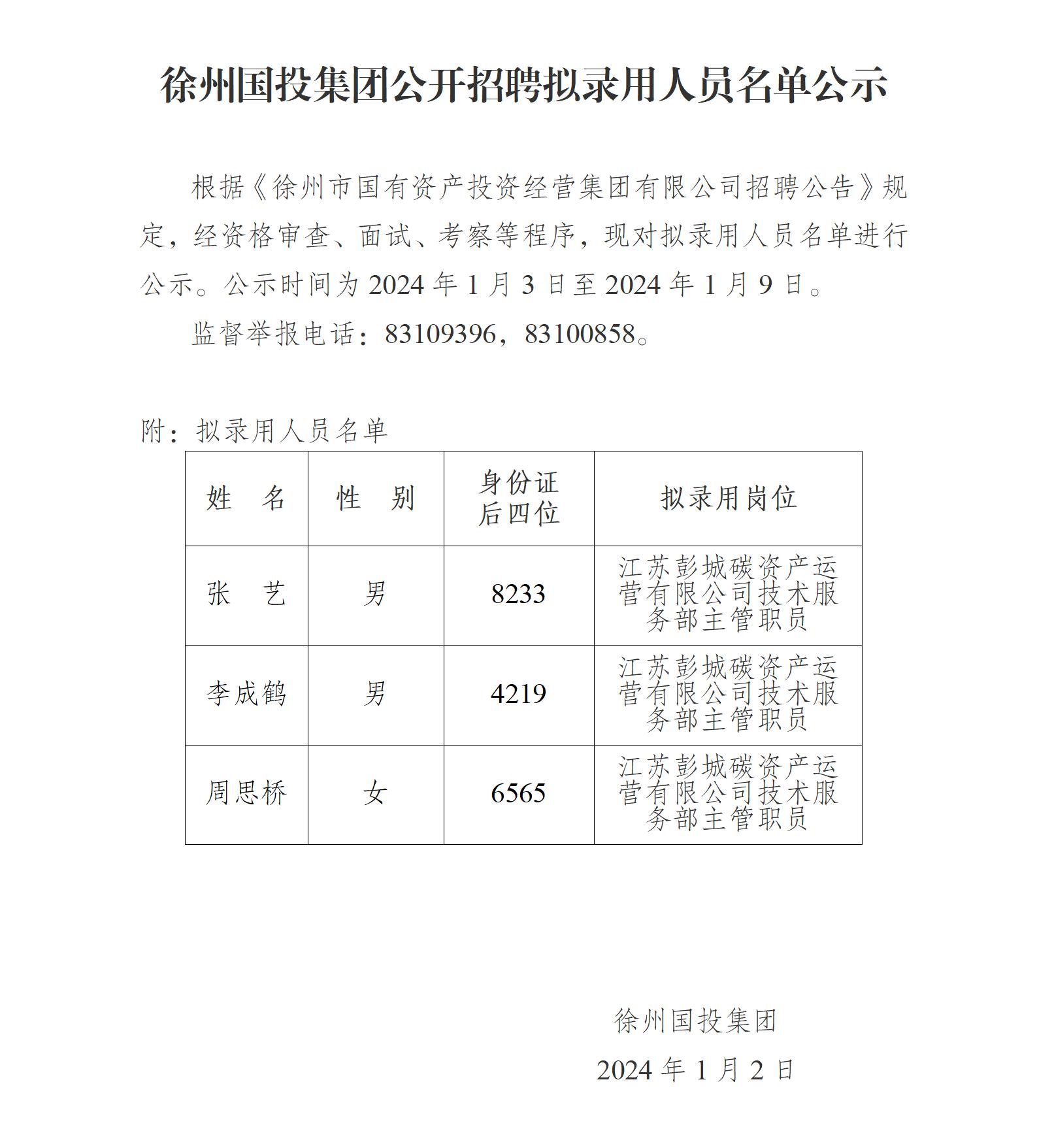 徐州國(guó)投集團(tuán)公開(kāi)招聘擬錄用人員名單公示