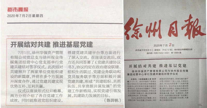 為深入貫徹黨的十九大精神,扎實(shí)推進(jìn)習(xí)近平新時(shí)代中國特色社會(huì)主義思想學(xué)懂弄通做實(shí),著力發(fā)揮黨建引領(lǐng)鑄魂聚力功能,不斷提升基層黨組織組織力、引領(lǐng)力、凝聚力。7月1日上午,適逢中國共產(chǎn)黨成立99周年華誕之際,徐州華強(qiáng)資產(chǎn)管理有限公司黨總支同徐州報(bào)業(yè)傳媒集團(tuán)經(jīng)營中心黨支部開展黨建結(jié)對(duì)共建活動(dòng),以一支一項(xiàng)“報(bào)業(yè)企業(yè)手拉手,助力兩新企業(yè)發(fā)展”為主題,形成“共建組織、共抓隊(duì)伍、共享資源,共謀發(fā)展”的基層黨建工作新格局,進(jìn)一步加強(qiáng)基層黨組織隊(duì)伍建設(shè),實(shí)現(xiàn)優(yōu)勢(shì)互補(bǔ),促進(jìn)改革創(chuàng)新,充分發(fā)揮基層黨組織的戰(zhàn)斗堡壘作用。7月2日徐州報(bào)業(yè)集團(tuán)分別在徐州日?qǐng)?bào)及都市晨報(bào)對(duì)此進(jìn)行刊登報(bào)道。