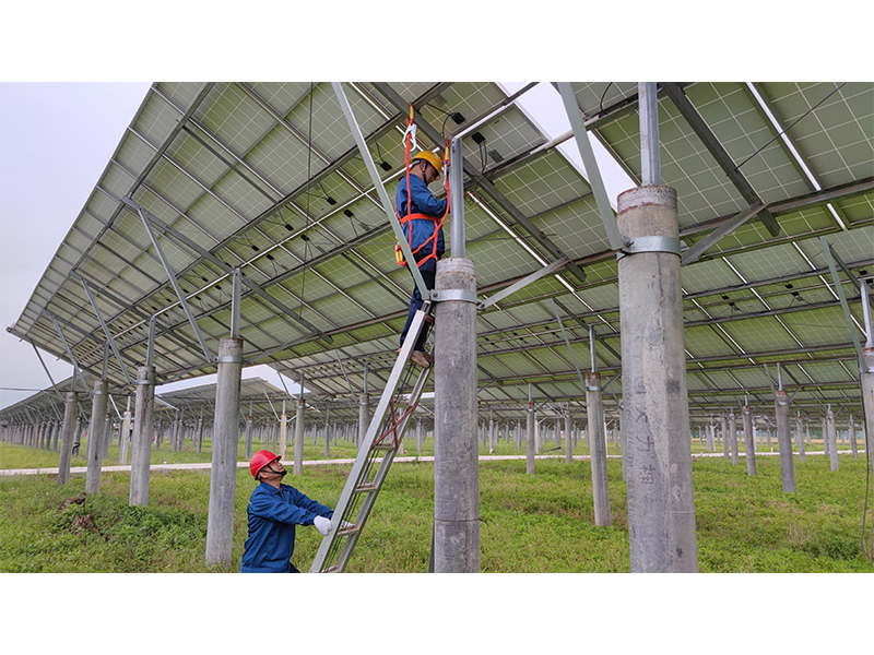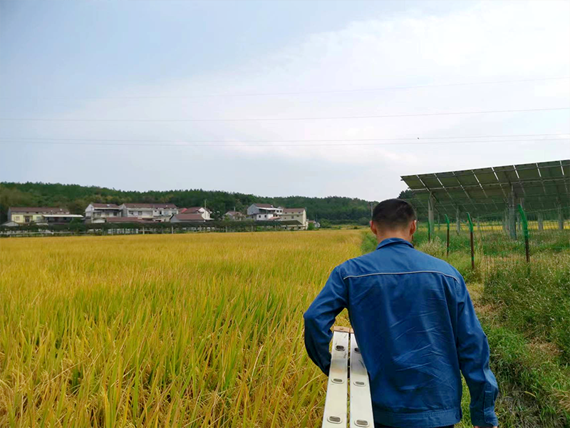 太湖鑫能電站位于安慶山區(qū),總裝機(jī)容量2萬千瓦,占地面積647畝,分別在三個(gè)不同地方,區(qū)域跨度大、道路條件差,有些光伏區(qū)甚至無法通車,只能攜帶沉甸甸的維修設(shè)備徒步前行,身體和設(shè)備維修都面臨著極大考驗(yàn)。10月1日上午11時(shí),驕陽似火,“秋老虎”的回歸使氣溫重返36度。電站班長謝文理帶領(lǐng)巡檢人員走在狹窄的田埂上,厚重的工作服下早已滲滿了汗水,他們已經(jīng)徒步巡檢了3公里的線路,走在最前面的謝文理在匯報(bào)完工作進(jìn)度后,轉(zhuǎn)頭對同行人員說“12點(diǎn)前必須把這個(gè)區(qū)域仔細(xì)巡檢一遍,下午再去剩下的區(qū)域”。說著他加快了腳步,一行人在泥濘的地面上留下了一串串深深的腳印。