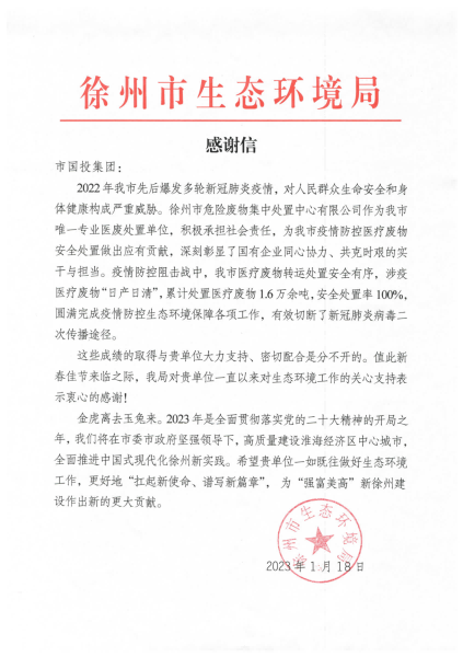 市生態(tài)環(huán)境局對集團(tuán)公司的感謝信中寫道:“2022年我市先后爆發(fā)多輪新冠肺炎疫情,對人民群眾生命安全和身體健康構(gòu)成嚴(yán)重威脅。徐州市危險廢物集中處置中心有限公司作為我市唯一專業(yè)醫(yī)廢處置單位,積極承擔(dān)社會責(zé)任,為我市疫情防控醫(yī)療廢物安全處置做出應(yīng)有貢獻(xiàn),深刻彰顯了國有企業(yè)同心協(xié)力、共克時艱的實干與擔(dān)當(dāng)。疫情防控阻擊戰(zhàn)中,我市醫(yī)療廢物轉(zhuǎn)運處置安全有序,涉疫醫(yī)療廢物‘日產(chǎn)日清’,累計處置醫(yī)療廢物1.6萬余噸,安全處置率100%,圓滿完成疫情防控生態(tài)環(huán)境保障各項工作,有效切斷了新冠肺炎病毒二次傳播途徑?!?