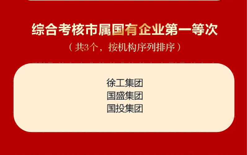 1月30日,徐州市委、市政府召開高質(zhì)量發(fā)展大會(huì),會(huì)議表彰了一批2022年度考核先進(jìn)單位,國投集團(tuán)榮獲位列綜合考核市屬國有企業(yè)第一等次,登上2022年度高質(zhì)量發(fā)展光榮榜。