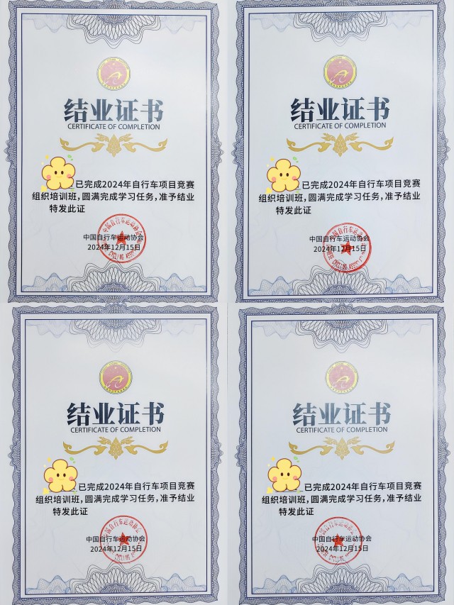 12月中旬,國體文化體育(徐州)有限公司(以下簡稱“國體徐州”)經(jīng)過了嚴格的篩選與審核,選拔了4名競賽組織管理人員參加了中國自行車運動協(xié)會組織的“2024年自行車項目競賽組織培訓”,并通過考核取得結業(yè)證書。