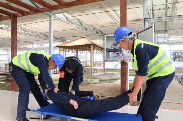 14時35分,刺耳的警報劃破寧靜,觸電搶救應(yīng)急演練率先登場。四名電站運維員工組成的應(yīng)急小組迅疾響應(yīng),嚴格按照預(yù)案流程行動。只見一人果斷切斷電源,另一人利用絕緣桿將“觸電者”安全脫離危險區(qū),其余隊員立即上前進行規(guī)范的心肺復(fù)蘇急救。整個過程緊張有序,展現(xiàn)了團隊在突發(fā)險情中的高效協(xié)作與過硬技能。演練結(jié)束,安全專家即時點評,對脫離電源的技術(shù)要點與心肺復(fù)蘇操作標準進行強化講解,切實提升現(xiàn)場人員的應(yīng)急實戰(zhàn)能力。