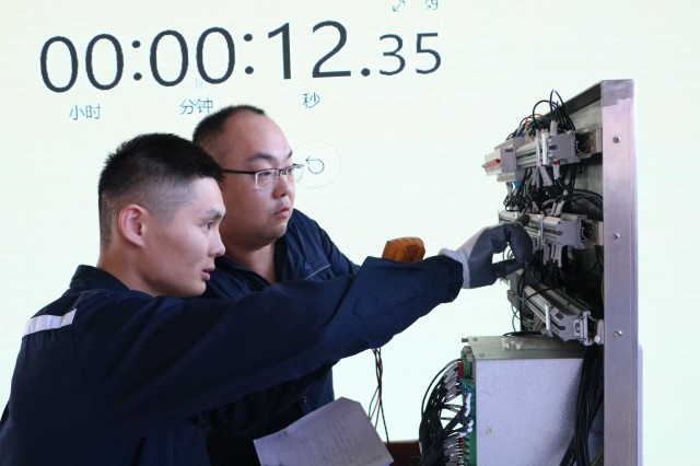 練兵場亦是競技臺。15時30分,高壓開關(guān)柜回路故障消缺實操比賽開始。多支參賽隊伍輪番上陣,在裁判嚴格監(jiān)督下展開較量。面對預(yù)設(shè)的復(fù)雜回路故障,選手們身著統(tǒng)一工裝,佩戴齊整防護,審閱圖紙、測試分析、精準排障。每一次舉手示意操作、每一次工具精準落點,都體現(xiàn)著“安全第一、規(guī)范先行”的鐵律。賽場氣氛緊張激烈,選手們沉著冷靜的故障診斷能力與嫻熟的動手能力贏得陣陣贊嘆。