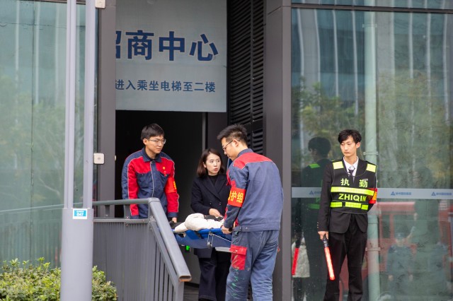 15:30,演練正式啟動。消控室值班人員發(fā)現(xiàn)消防主機報警后,立即查看著火點信息,迅速通知巡邏崗前往核實。巡邏崗抵達513室后,發(fā)現(xiàn)現(xiàn)場濃煙冒出且有被困人員,立即向中控室報告。通訊聯(lián)絡組隨即啟動應急程序,將消防主機切換為自動狀態(tài),并向總指揮匯報火情??傊笓]果斷下達指令,各專項小組迅速響應,按照預案展開行動。隨著滅火行動組成功撲滅全部明火,各小組依次向總指揮匯報任務完成情況,滅火救援綜合實戰(zhàn)演練部分圓滿結束。