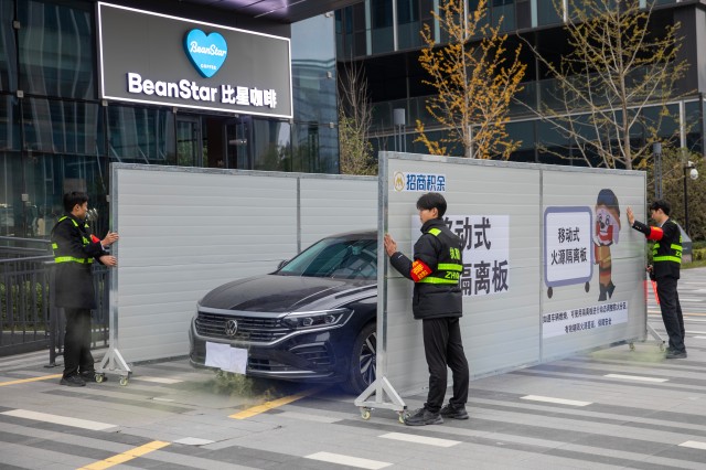 隨后,開始進行新能源汽車自燃應急處置演練,演練使用了招商積余物業(yè)針對新能源汽車自燃的專業(yè)滅火裝置,可以快速有效處置新能源汽車底部自燃情況。